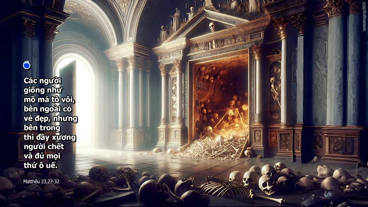 Khi ấy, Đức Giê-su nói với các kinh sư và những người Pha-ri-sêu rằng : “Khốn cho các người, hỡi các kinh sư và người Pha-ri-sêu đạo đức giả ! Các người giống như mồ mả tô vôi, bên ngoài có vẻ đẹp, nhưng bên trong thì đầy xương người chết và đủ mọi thứ ô uế. Các người cũng vậy, bên ngoài thì có vẻ công chính trước mặt thiên hạ, nhưng bên trong toàn là đạo đức giả và gian ác ! “Khốn cho các người, hỡi các kinh sư và người Pha-ri-sêu đạo đức giả ! Các người xây mồ cho các ngôn sứ và tô mả cho những người công chính. Các người nói : “Nếu như chúng ta sống vào thời của tổ tiên, hẳn chúng ta đã không thông đồng với các ngài mà đổ máu các ngôn sứ.” Như vậy, các người tự làm chứng rằng các người đúng là con cháu của những kẻ đã giết các ngôn sứ. Thì các người đổ thêm cho đầy đấu tội của tổ tiên các người đi !” Đó là Lời Chúa.
