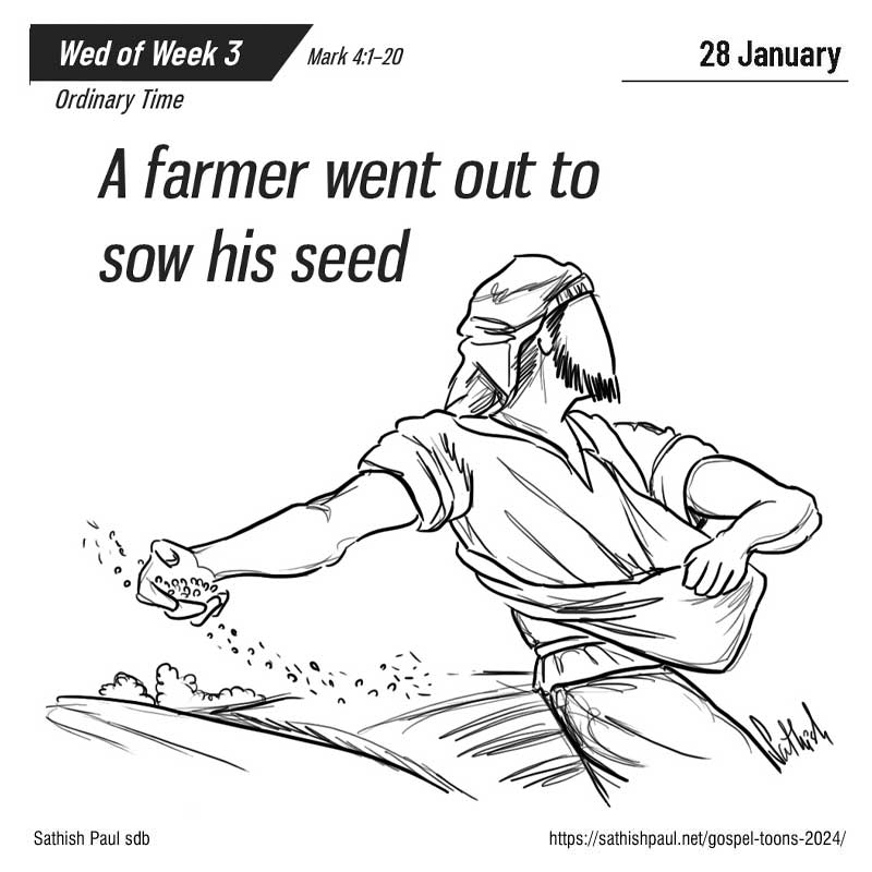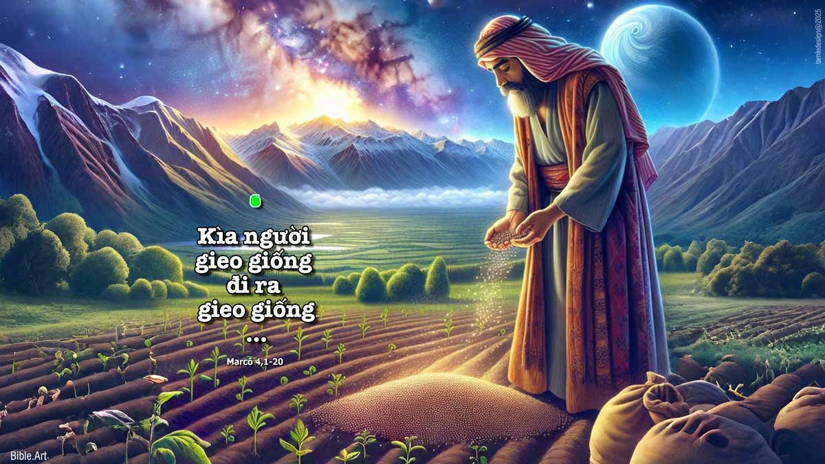 Một hôm, Đức Giê-su lại bắt đầu giảng dạy ở ven Biển Hồ. Dân chúng tụ họp bên người rất đông, nên Người phải xuống ngồi trên thuyền đang đậu dưới biển, còn tất cả dân chúng thì ở trên bờ. Người dùng dụ ngôn mà dạy họ nhiều điều. Trong lúc giảng dạy, Người nói với họ: “Các người nghe đây! Kìa người gieo giống đi ra gieo giống. Trong khi gieo, có hạt rơi xuống vệ đường, chim chóc đến ăn mất. Có hạt rơi trên sỏi đá, chỗ không có nhiều đất; nó mọc ngay, vì đất không sâu; nhưng khi nắng lên, nó liền bị cháy, và vì thiếu rễ nên bị chết khô. Có hạt rơi vào bụi gai, gai mọc lên làm nó chết nghẹt và không sinh hoa kết quả. Có những hạt lại rơi nhằm đất tốt, nó mọc và lớn lên, sinh hoa kết quả: hạt thì được ba mươi, hạt thì được sáu mươi, hạt thì được một trăm.” Rồi Người nói: “Ai có tai nghe thì nghe!” Khi còn một mình Đức Giê-su, những người thân cận cùng với Nhóm Mười Hai mới hỏi Người về các dụ ngôn. Người nói với các ông: “Phần anh em, mầu nhiệm Nước Thiên Chúa đã được ban cho anh em; còn với những người kia là những kẻ ở ngoài, thì cái gì cũng phải dùng dụ ngôn, để họ có trố mắt nhìn cũng chẳng thấy, có lắng tai nghe cũng không hiểu, kẻo họ trở lại và được ơn tha thứ.” Người còn nói với các ông: “Anh em không hiểu dụ ngôn này, thì làm sao hiểu được tất cả các dụ ngôn? Người gieo giống đây là người gieo lời. Những kẻ ở bên vệ đường, nơi lời đã gieo xuống, là những kẻ vừa nghe thì Xa-tan liền đến cất lời đã gieo nơi họ. Còn những kẻ được gieo trên sỏi đá là những kẻ khi nghe lời thì liền vui vẻ đón nhận, nhưng họ không đâm rễ mà là những kẻ nông nổi nhất thời; sau đó, khi gặp gian nan hay bị ngược đãi vì lời, họ vấp ngã ngay. Những kẻ khác là những kẻ được gieo vào bụi gai: đó là những kẻ đã nghe lời, nhưng những nỗi lo lắng sự đời, bả vinh hoa phú quý cùng những đam mê khác xâm chiếm lòng họ, bóp nghẹt lời khiến lời không sinh hoa kết quả gì. Còn những người khác nữa là những người được gieo vào đất tốt: đó là những người nghe lời và đón nhận, rồi sinh hoa kết quả, kẻ thì ba mươi, kẻ thì sáu mươi, kẻ thì một trăm.” Đó là lời Chúa.